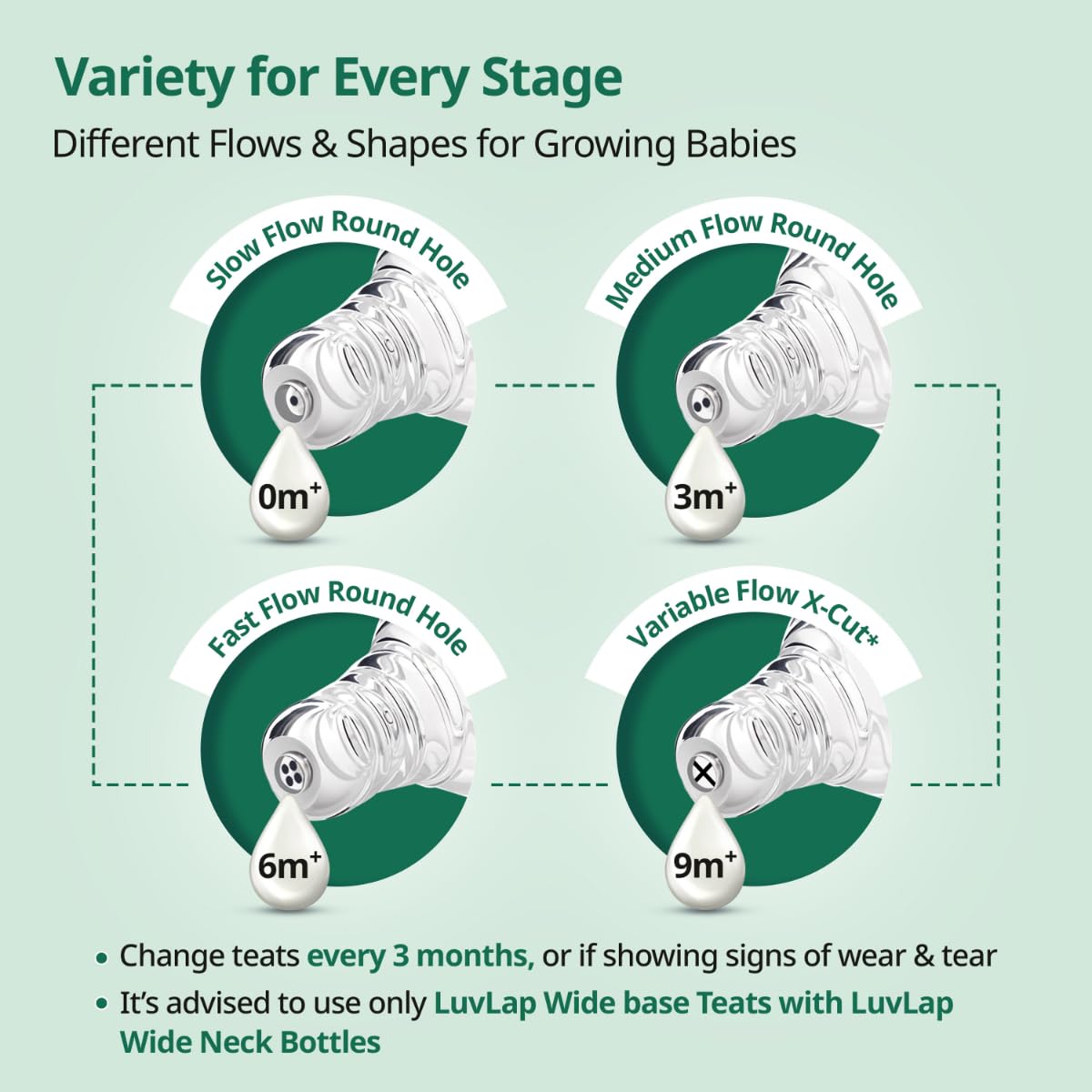 LuvLap Natura Flo Wide Neck Nipple | L Hole Fast Flow | Anti Colic Venting System | BPA FREE | 6M+ (1 Pair)