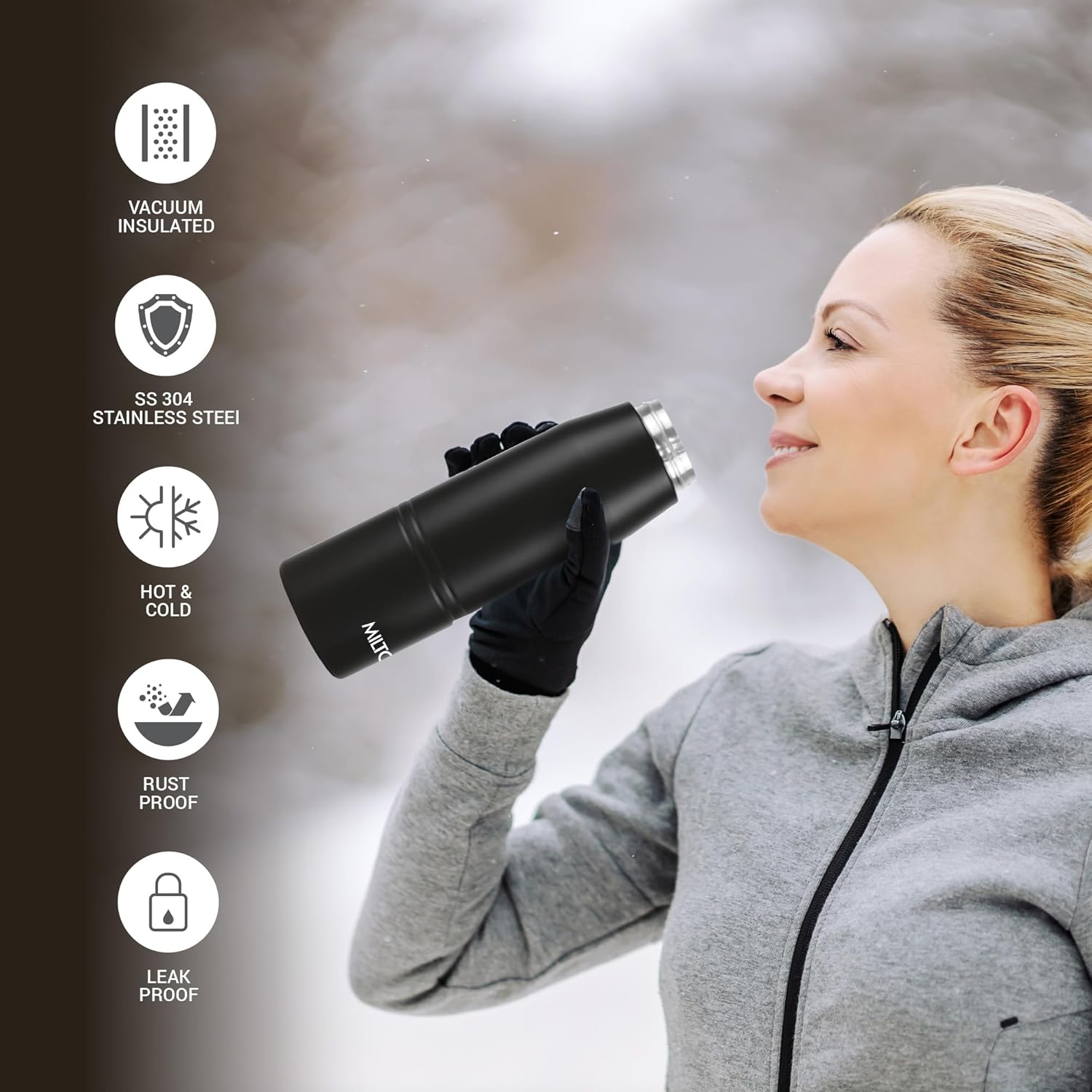 Milton Sparkle 600 Thermosteel Water Bottle with Easy Sip Cap and Handle, 625 ml, Vacuum Insulated Stainless Steel, Hot and Cold, On The Go Bottle for Office College, Black